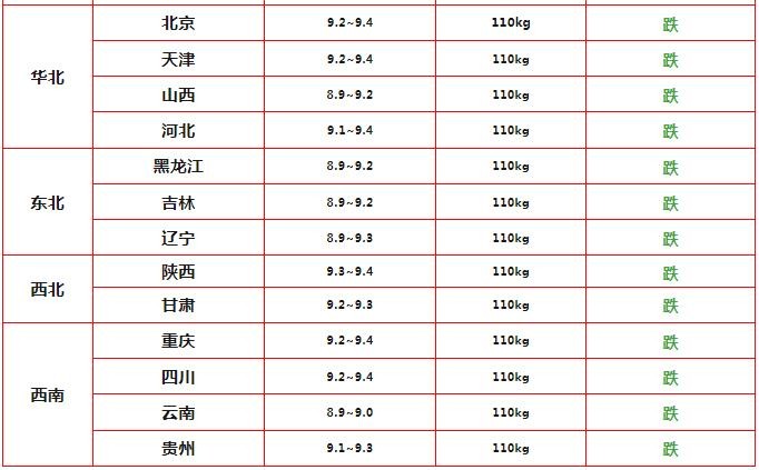 华北地区:河北下跌0.1元/斤,标猪出栏参考价9.1~9.4元/斤。
