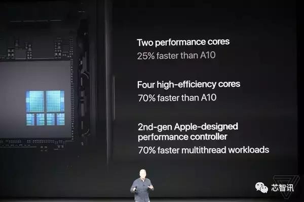 具体性能方面,A11 BIONIC号称其两颗性能核心就比前代的A10整体快了25%;四颗效率核心更是比A10提升了70%。整体的CPU性能比A10提升了70%。