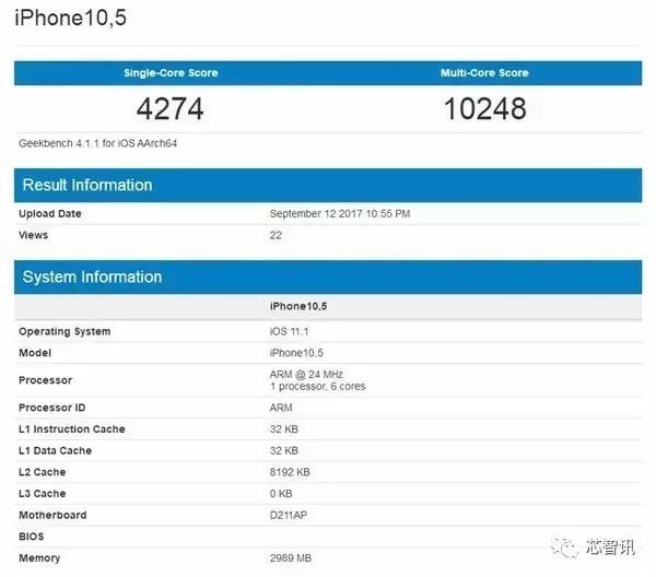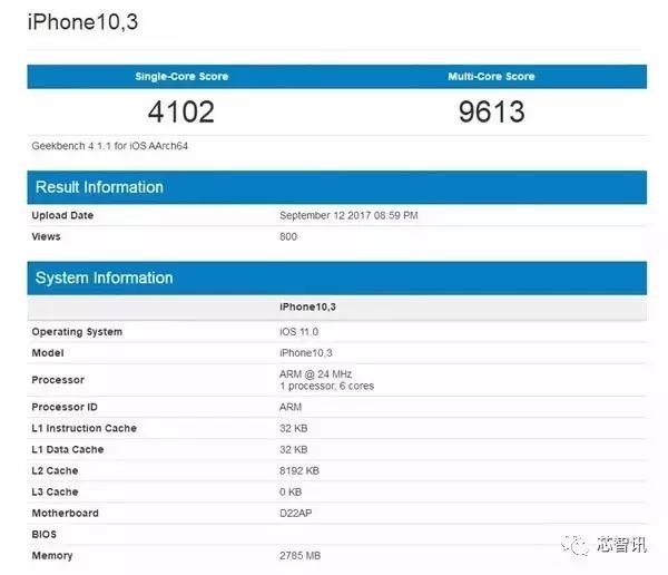 iPhone 10,3 的跑分数据显示,在iOS 11下A11处理器的成绩可达4102/9613分。