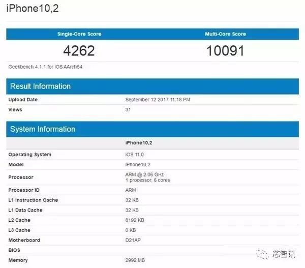 从iPhone 10,2 的设备的跑分数据来看,在iOS 11下A11处理器的GeekBench 4.1.1的成绩可达4262/10091分。同时GeekBench 识别出了A11的主频为2.06GHz,此外也显示这款iPhone的内存为3GB。