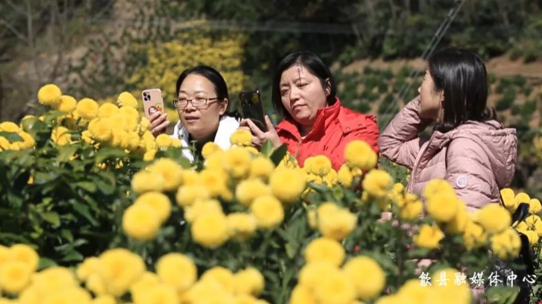 11月10日,在海拔近700米的皇菊主产区溪头镇汪满田村,连绵起伏的山坡上,黄灿灿的菊花竞相绽放,层层叠叠,宛如油画铺展开来。前来赏花闻香、拍照打卡的游客陶醉其中、流连忘返。