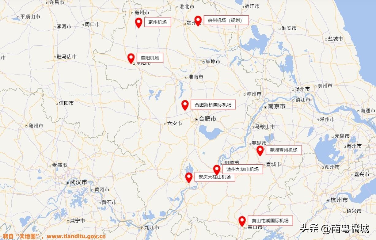 目前,安徽省境内拥有7个运输机场,包括4E级枢纽干线机场——合肥新桥国际机场、4D级民用运输机场——黄山屯溪国际机场、4C级支线机场——安庆天柱山机场、池州九华山机场、芜湖宣州机场、阜阳机场和有望在今年开通运营的亳州机场;除此之外,安徽省还拥有肥东白龙、宁国市青龙湾和即将开通运营的明光女山湖机场等3个A类通用机场。目前,安徽省境内的民用机场已经开通航线200余条,覆盖国内外100多个大中城市,形成“一枢十支多点”的机场发展格局。