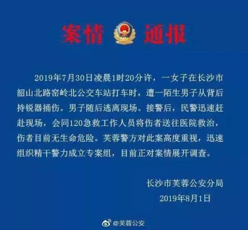 12点25分,芙蓉公安发布案情通报:2019 年7月30日凌晨1时20分许,一女子在长沙市韶山北路窑岭北公交车站打车时,遭一陌生男子从背后持锐器捅伤。男子随后逃离现场。