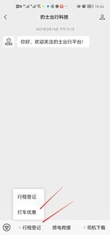第二步,进入“的士出行科技”程序,点击下方菜单“行程登记”,选择“打车优惠”进入“的士出行平台”。