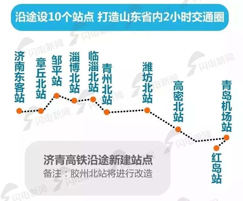 济青高铁是国家批复的第一条地方自主投资建设的高速铁路,线路全长307.8公里。济青高铁贯通山东半岛,设济南新东站、章丘北站、邹平站、淄博北站、临淄北站、青州北站、潍坊北站、高密北站、青岛机场站、红岛站。