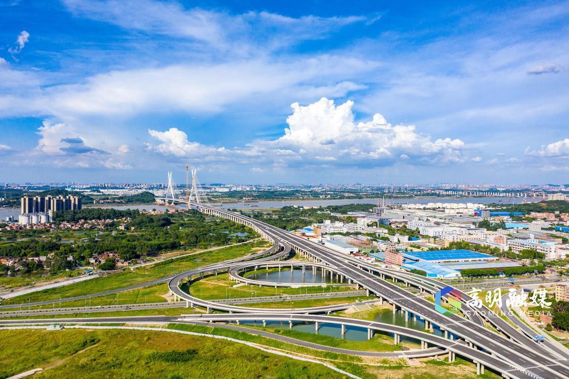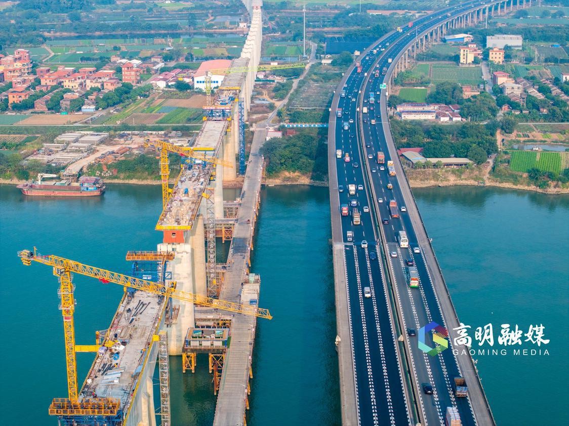 广明高速富湾特大桥则是高明第二座“东出口”桥梁。目前,富湾特大桥旁边的是正在全力建设中广湛高铁西江特大桥。