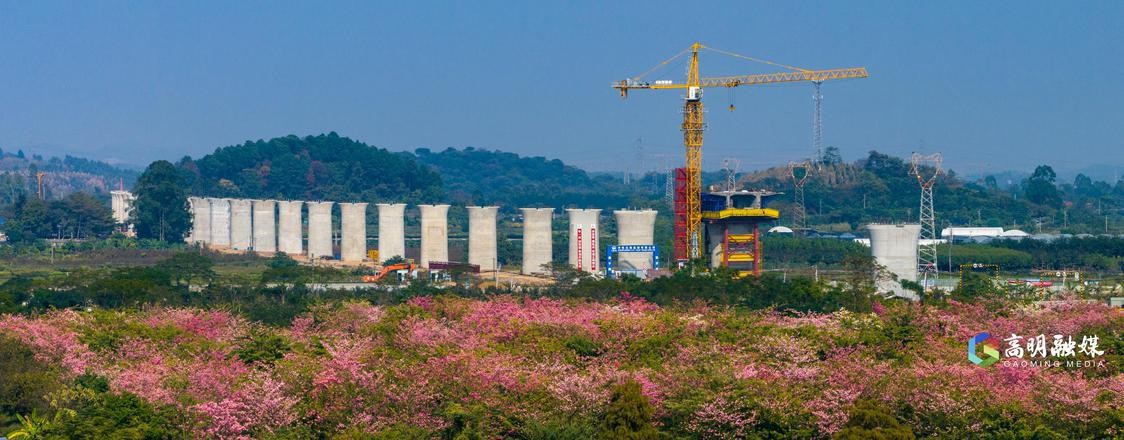 珠肇高铁高肇段,桥墩已经形成桥梁雏形,被沿线的美丽异木棉装扮着。
