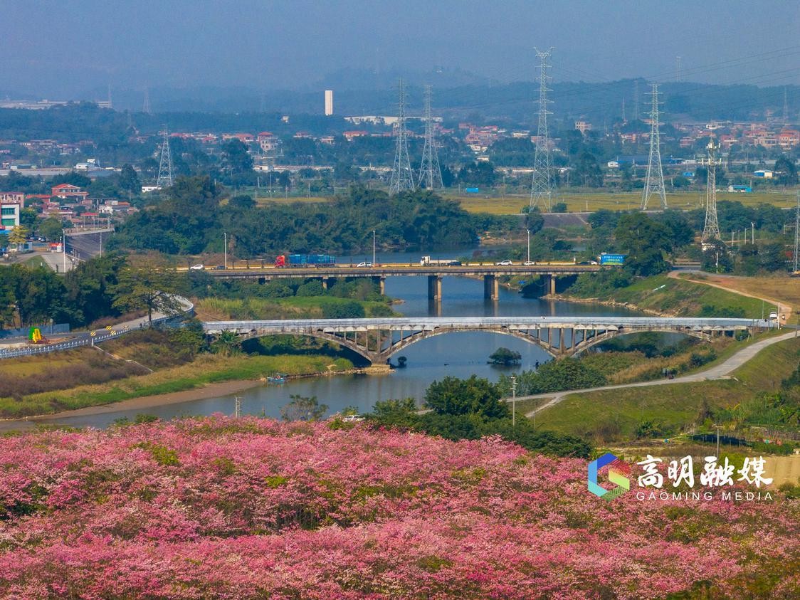 明城镇内,跨过沧江河的桥梁被粉色的美丽异木棉装扮着。