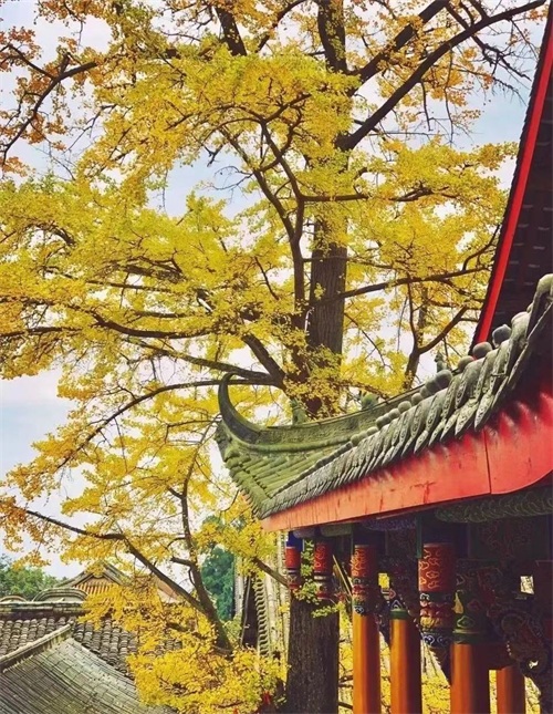 叶黄如金,与寺相伴,禅意弥漫。古色古香的寺庙与枝繁叶茂的银杏相互交织,简直让人挪不开眼。不仅银杏迷人,在慈云寺你还能看到红枫银杏交相辉映,小小一隅古寺,却浓缩了整个秋天的颜色。