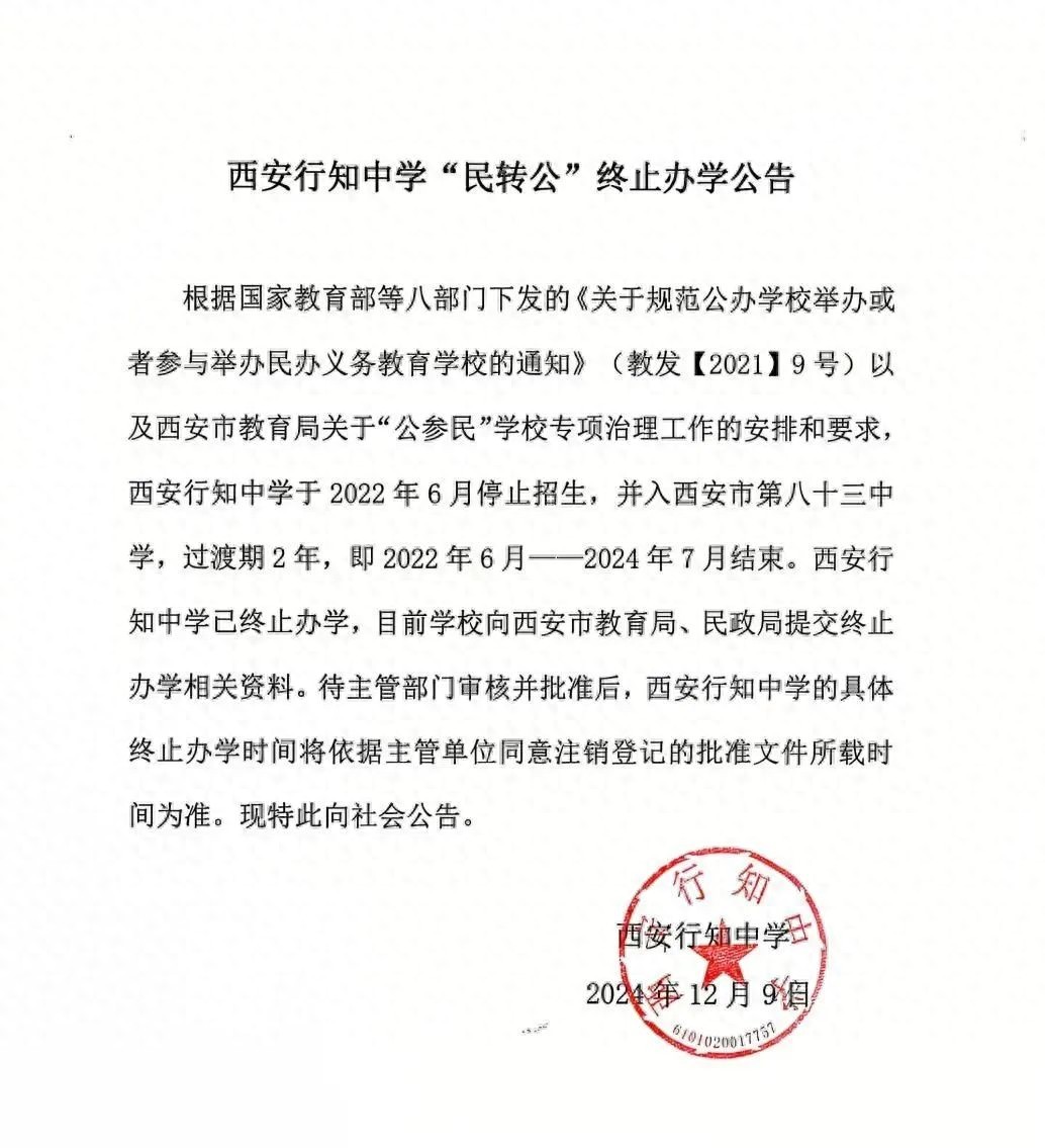 近日,西安行知中学发布关于“民转公”终止办学公告。