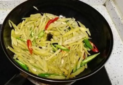3、锅中放油,油热后放入佐料和切好的狗儿豆翻炒