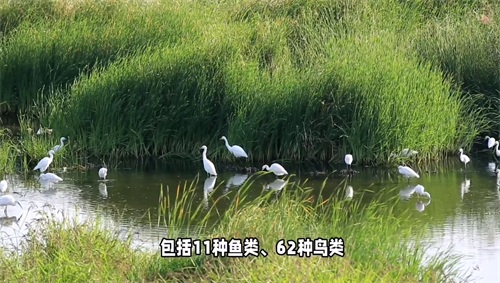 园内有着丰富的生物多样性,包括 11 种鱼类、62 种鸟类,以及千亩红莲和芦苇荡,是东方白鹤等国家重点保护动物的栖息地。
