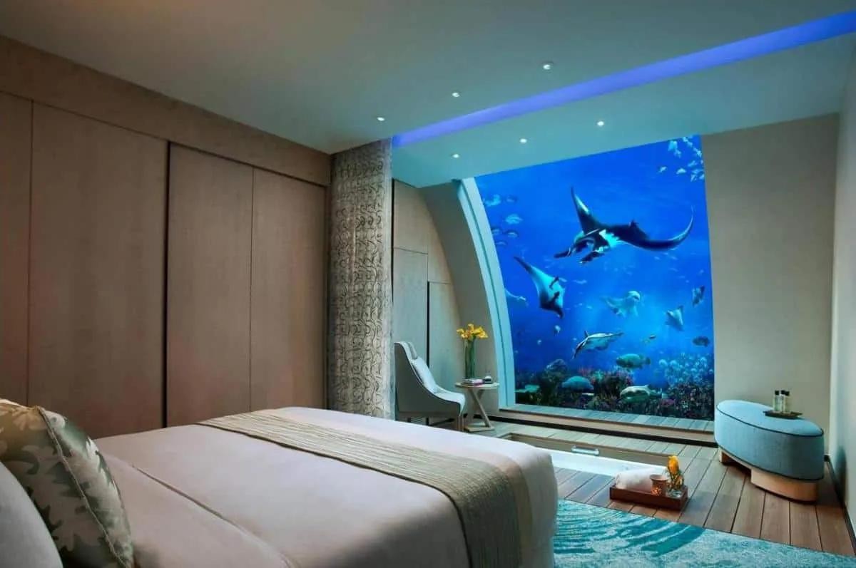 迪拜的一切都很昂贵,棕榈岛亚特兰蒂斯水下的两间套房也是如此。 您可以在 Neptune 或 Poseidon 之间进行选择,它们都包括免费机场交通、30 分钟免费个人培训课程和 24/7 客房内用餐。 拥有阿拉伯海的壮丽景色,看了您可能都不想离开您的房间了。