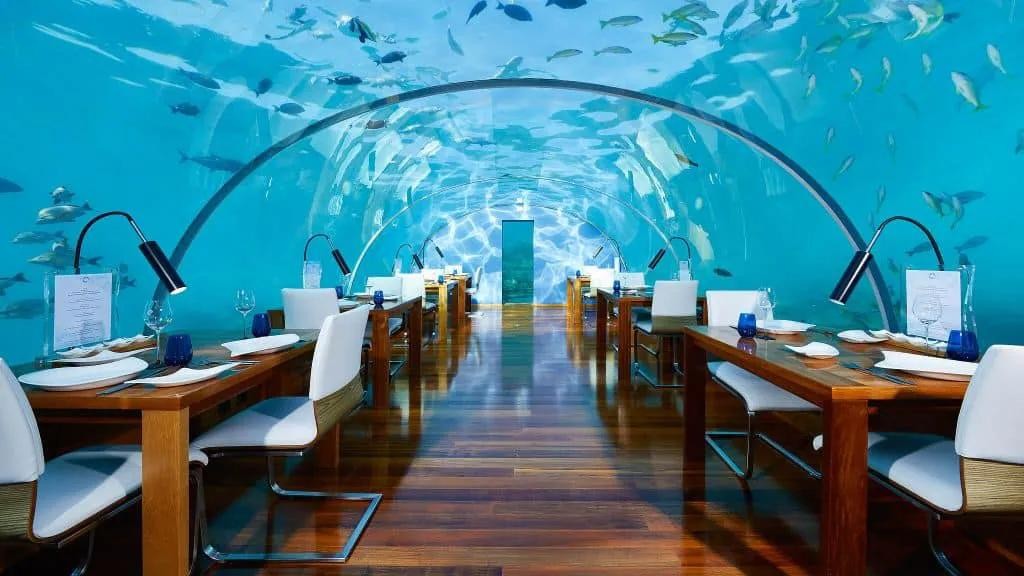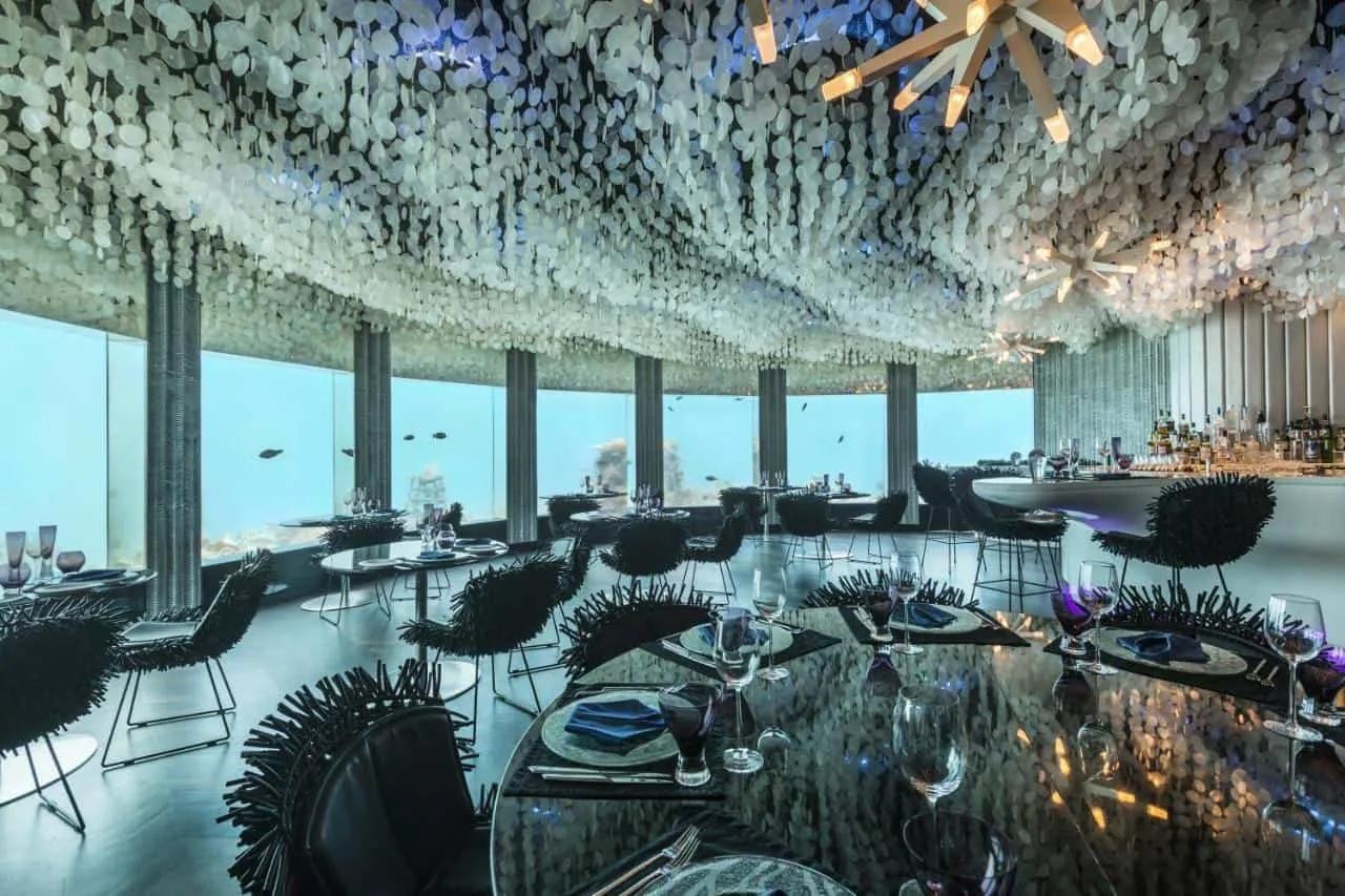 这家水下高级餐厅位于印度洋中部的 Niyama 酒店内。 要到达那里,您可以从大陆乘坐快艇并下三层楼梯。 在那里可以享用美味的早餐、午餐或晚餐,在被水环绕的同时欣赏美景。