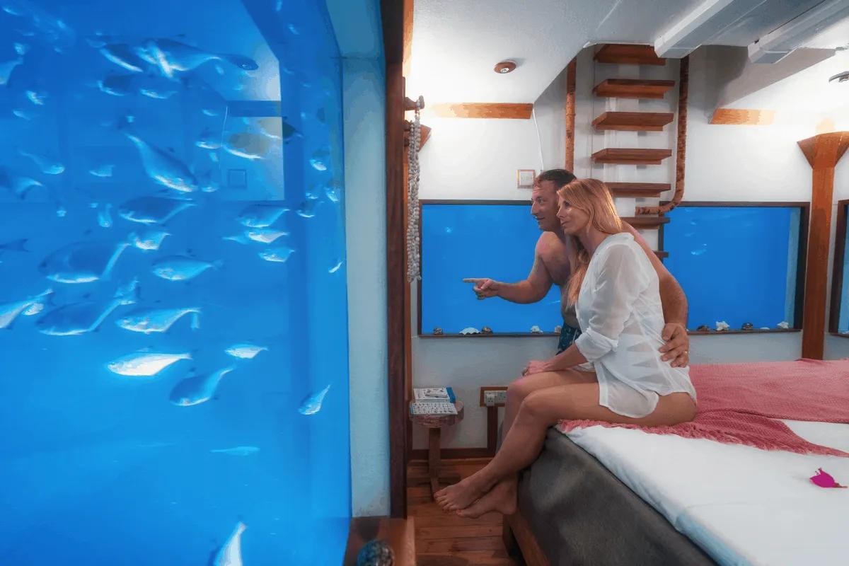 然后呢,您可以回到位于甲板下方的私人房间。 落地窗和墙到墙的窗户为您提供了所有海洋生物的 360 度全景。