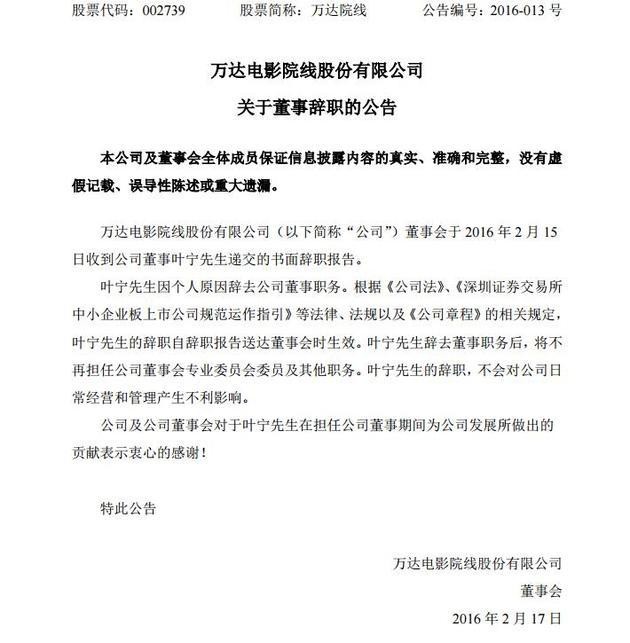 其实在昨晚万达院线发布公告称,公司董事会于2016年2月15日收到公司董事叶宁递交的书面辞职报告。并称叶宁是因个人原因辞去公司董事职务,并称其离职不会对公司日常经营和管理产生不利影响。