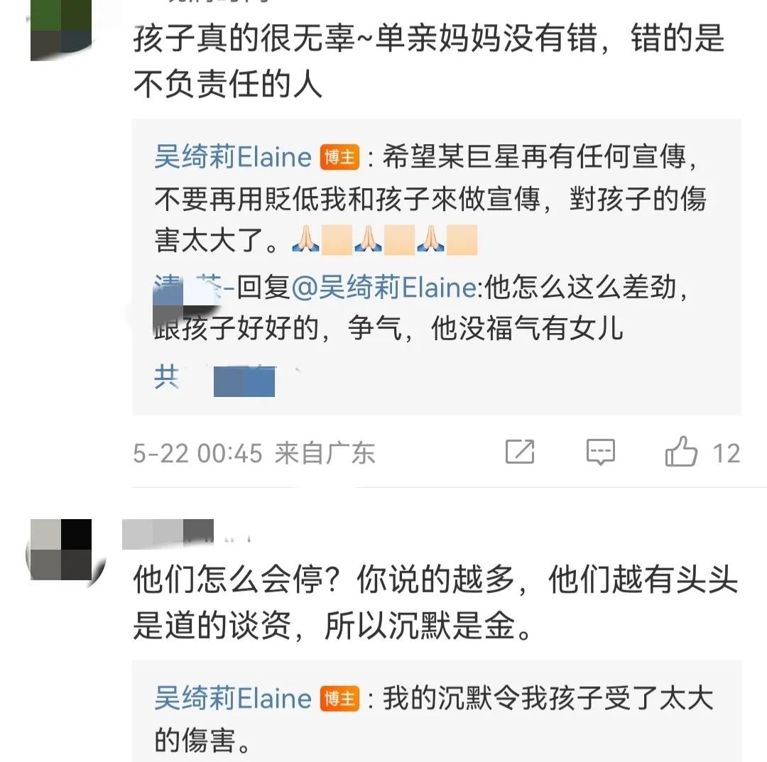 5月22日凌晨,吴绮莉突然发了一条长文,喊话“某巨星”,说她年轻时因为任性犯的错误,她自己承担,但是孩子起好无辜的,恳请他不要再伤害孩子!