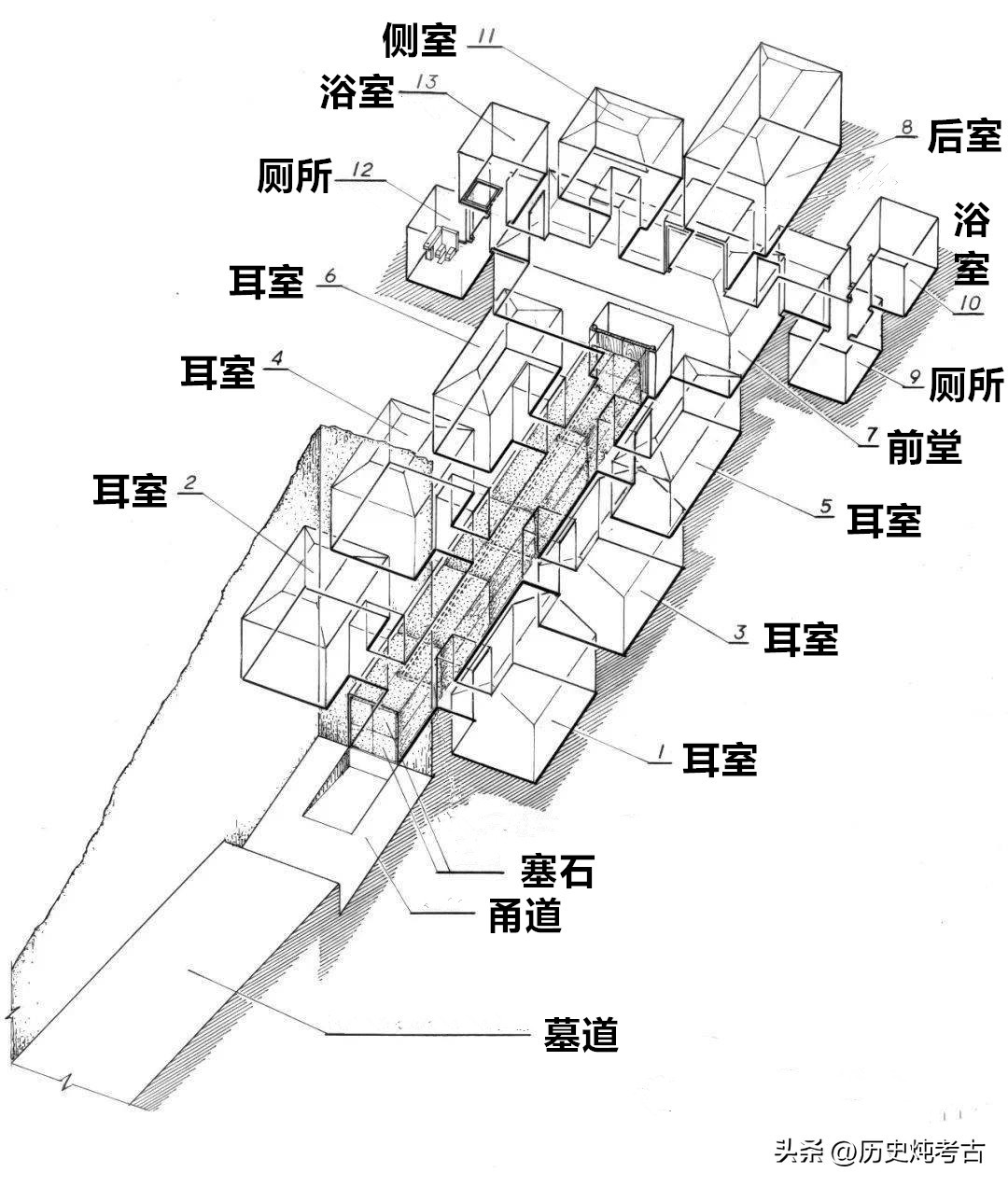 一号墓全长57.34米,由墓道、甬道以及主室三个部分组成。墓道长26米、宽4.6米,向下倾斜20°,墓道的尽头为甬道,长17.22米、宽2米、高2米,填充5组每组4块共20块塞石,每块塞石长3米、宽高均1米,重10吨,塞石上有盗墓贼凿刻的“牛鼻孔”。甬道两侧凿出3对6间侧室,两两相对,尽头为主室,有前堂、后室、侧室、厕所、浴室等,室内面积199平方米。考古发掘时,该墓早已被盗,陪葬品所剩无几,仅出土陶俑、陶金饼、铠甲片等若干,但铠甲片的出现,说明了一号墓墓主为男性。结合墓葬规模和形制,此处应是一座西汉早期的楚王陵!