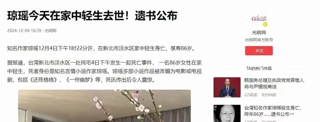 12月初,言情文学泰斗琼瑶在家中安然离世,享年86岁。这一消息让无数读者感慨万千。作为一位陪伴几代人成长的作家,琼瑶以《窗外》《一帘幽梦》等经典作品,书写了无数个引人入胜的爱情故事,深深烙印在华语文学的版图中。