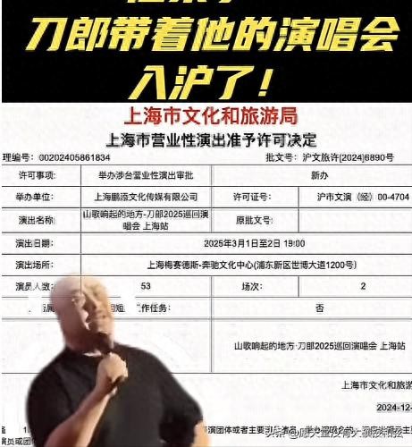 近日,刀郎“山歌响起的地方”中国巡回演唱会迎来了新的重大好消息:上海文旅官方账号置顶了一则关于刀郎演唱会的公告,并配文道:来了来了,他来了!刀郎带着演唱会入沪了!并且配上了关于上海文旅对于刀郎“中国巡回演唱会“的批复文件:表明“山歌响起的地方·刀郎2024巡回演唱会上海站正式获得批准,日期为3月1日至2日。于上海顶级场馆:梅赛德斯-奔驰文化中心开唱。