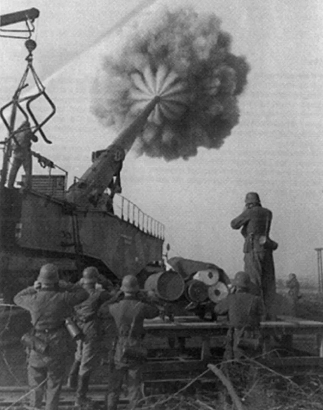 重型炮兵包括装备最大口径为190毫米的加农炮连,以及装备300、50、350和420毫米榴弹炮和迫击炮连。此外,还有2门口径为600毫米的火炮和有名的800毫米“多拉”火炮。后者最初是为对付马其诺防线最坚固的工事而设计的,但没有用上。它称得上炮兵技术的一个奇迹。它的炮管长约30米,炮架高达两层楼,需要60辆列车才能将这个怪物置放在它特有的轨道上。为保障其安全,有两个高炮营时刻守护在其左右。毫无疑问,从能效比来看是很不上算的。不过,它的一发炮弹击毁了苏军在谢书尔纳亚湾北部的一个位居岩石下30米深的弹药库。”