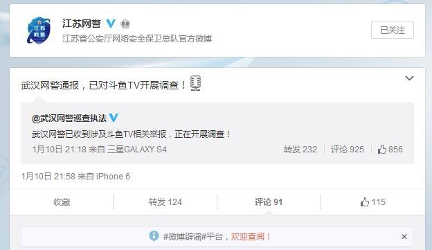 10日21时许,武汉网警通报,已对斗鱼TV展开相关调查,事件就此告一段落。