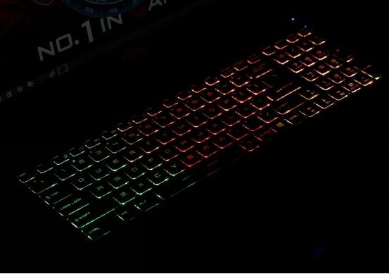 最后就不得不提的就是GE 62的键盘了,也是少有的好手感和炫酷光污染。采用了SteelSeries专业键盘,也是目前市面上最专业级游戏键盘,耐用度比普通键盘要高,而且键盘按键回馈力很强,手感比较舒服。在键盘区右上角我们可以看到有三个快捷按键,中间的快捷键则为背光的切换按钮,用户可以在多种背光方案中进行切换(单色与多彩)。所以可以做到一键切换键盘背光。在游戏本中都非常少见的设置,好处就是视觉效果极炫,并且在弱光环境下也减少了误触的几率。