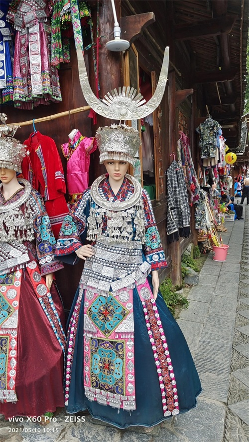 苗寨中租苗族服装的商店很多。也有不少游客都在租衣拍照。