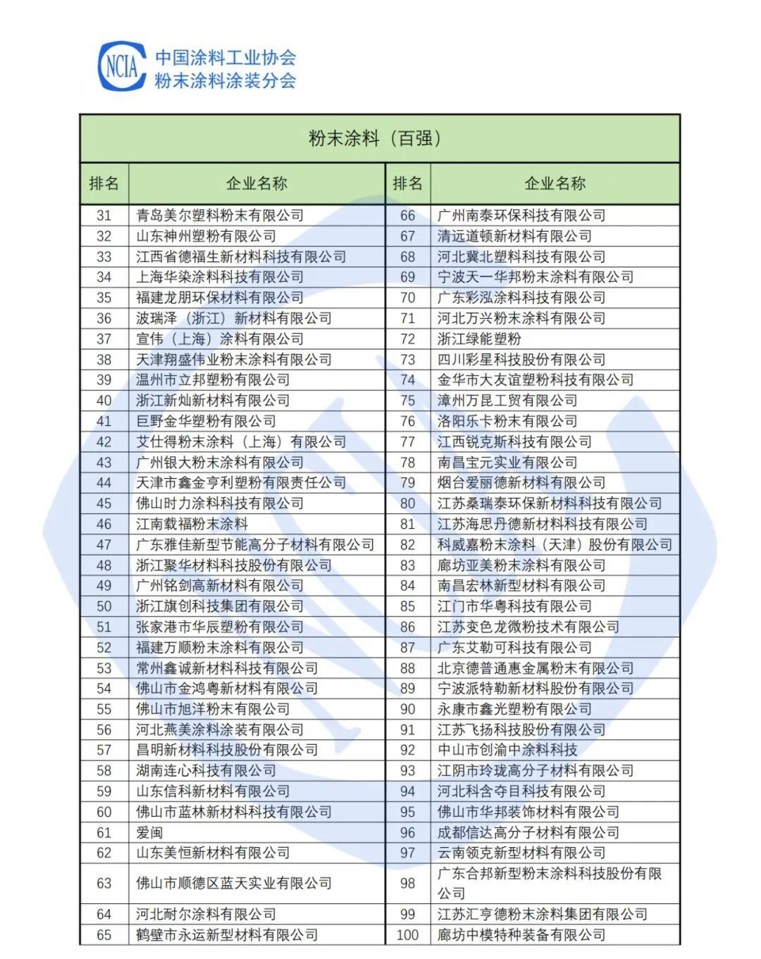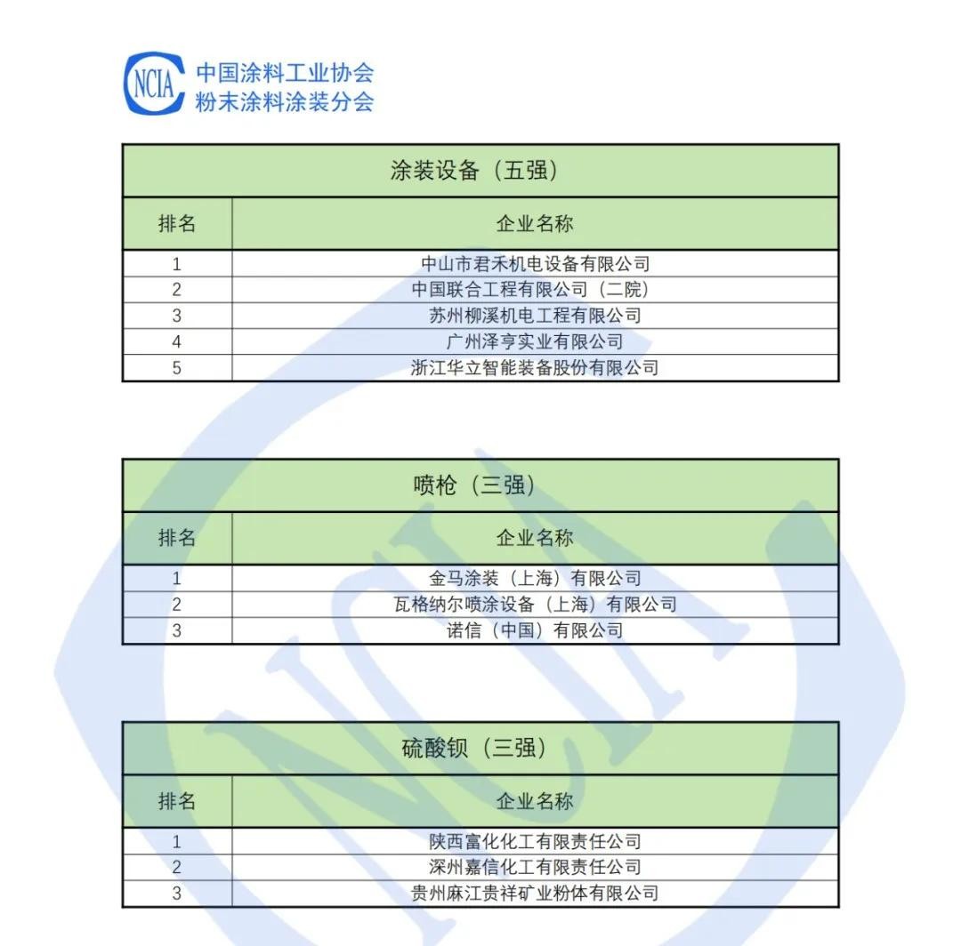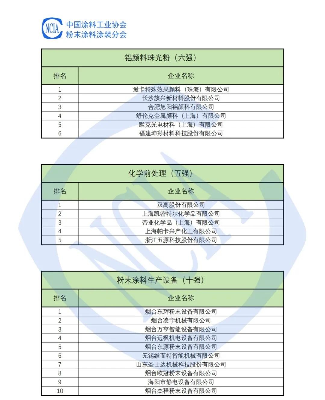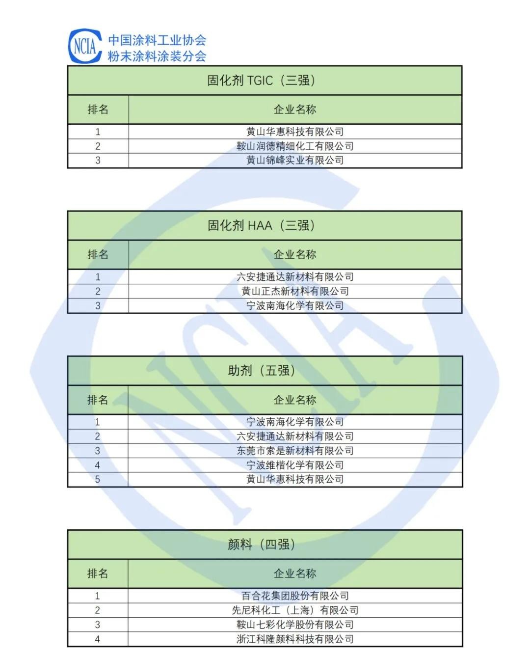 涂界记者4月30日获悉,中国涂料工业协会粉末涂料涂装分会今日公布2023中国粉末涂料企业百强榜单,同期还公布聚酯树脂十三强、环氧树脂十强、固化剂TGIC三强、固化剂HAA三强、助剂五强、颜料四强、铝颜料珠光粉六强等系列榜单。该排名按照国际惯例采用未税营业额为基准。