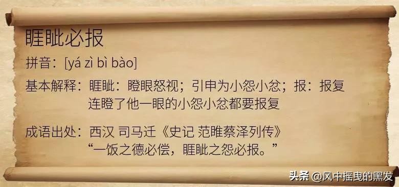 【成语出处】: 西汉·司马迁《史记·范雎蔡泽列传》:“一饭之德必偿,睚眦之怨必报。”
