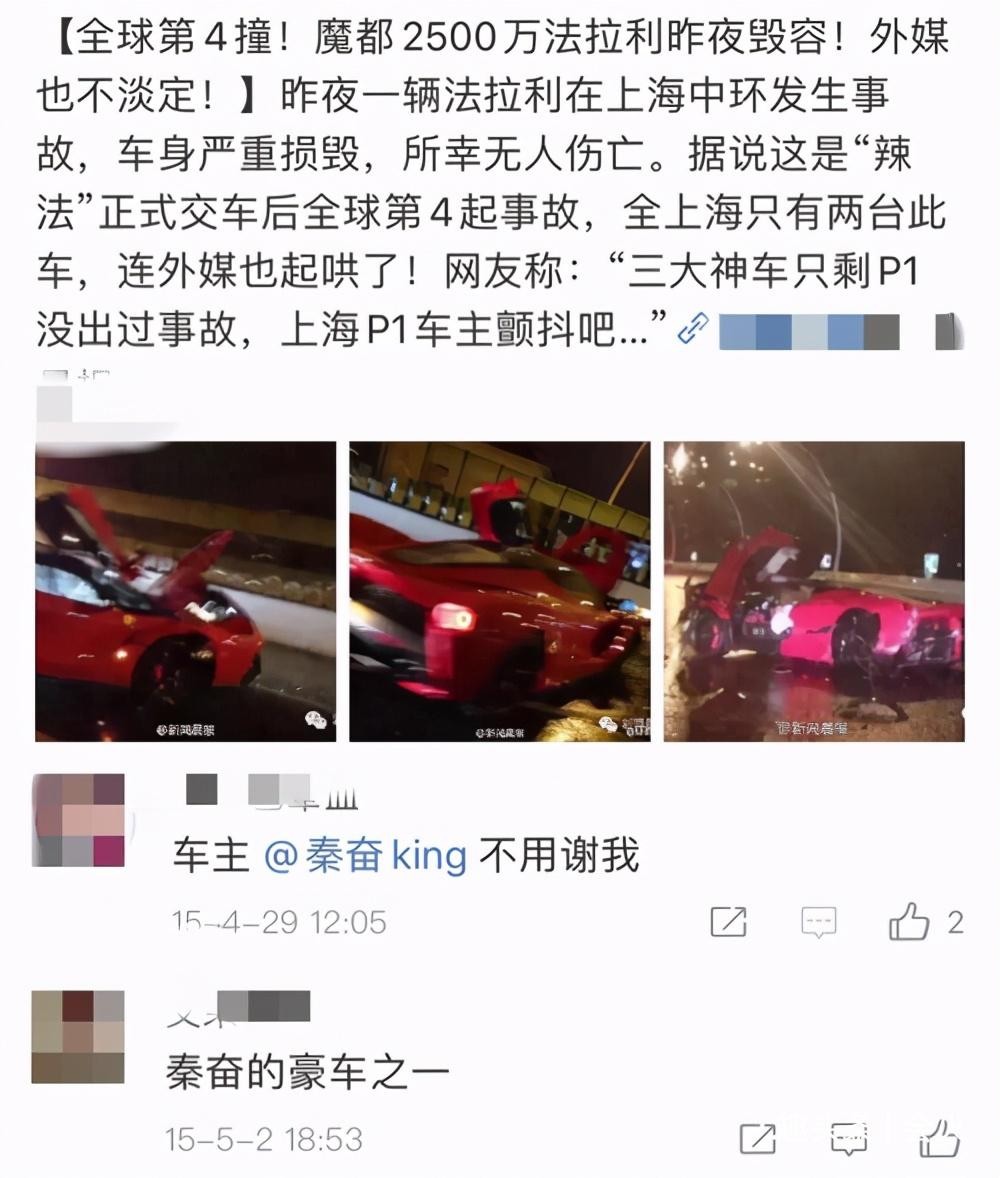 就比如前面提到的贾青,秦奋最出名的事件之一,当属是2015年4月28号的上海拉法车祸,具体过程很简单,无非是富二代开着价值两千多万的法拉利出了车祸,完成了全球第四撞,中国第一撞的奇怪成就。