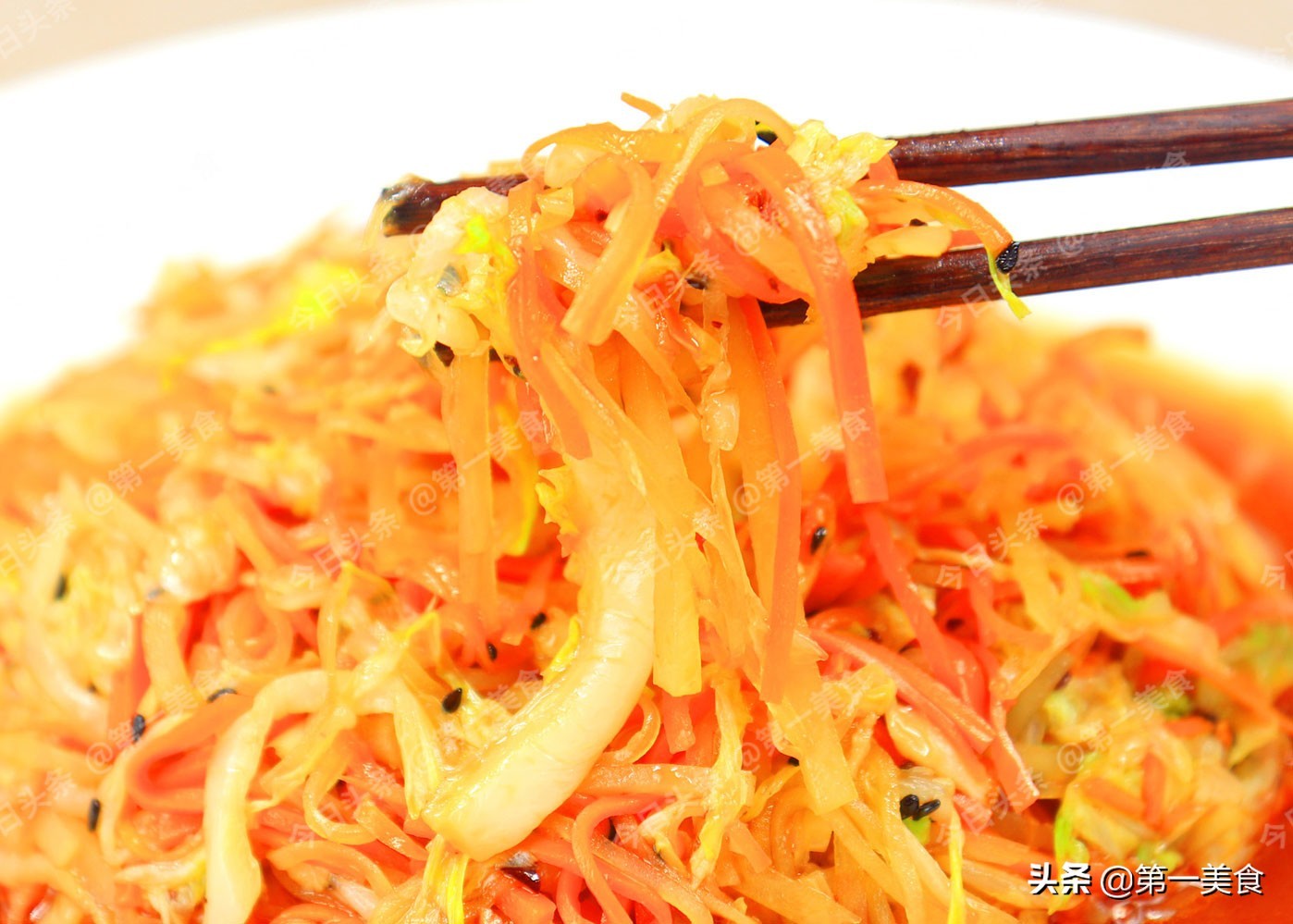 把咱准备好的白菜丝、土豆丝、胡萝卜丝往盆里一入,再把这料汁往里一倒,这香味嗷一声就冲上来了。