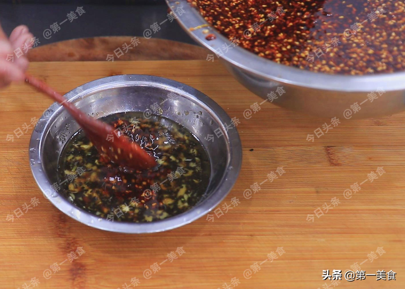 切点蒜末、小米椒圈。