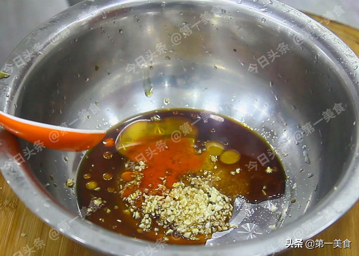切点蒜末,倒在盆里,加食盐,生抽、香醋、辣椒红油,多倒点芝麻香油,别舍不得往里放,全靠芝麻香油提味呢。