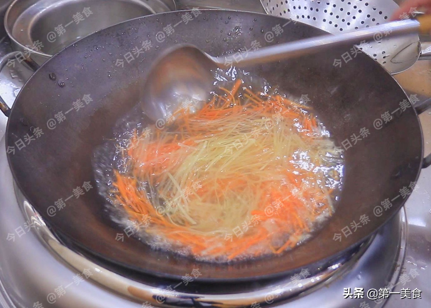 1.切点胡萝卜丝、土豆丝。