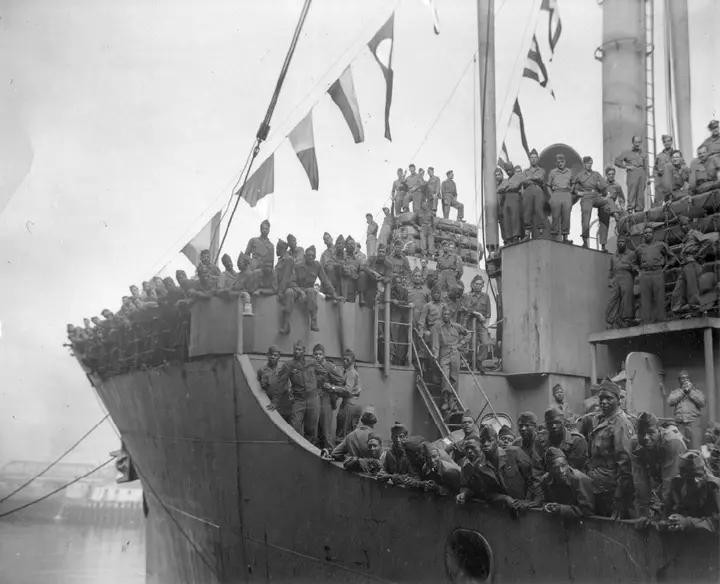 1945年7月26日,“艾肯·胜利”号运兵船运载着1958名美军士兵从欧洲抵达波士顿