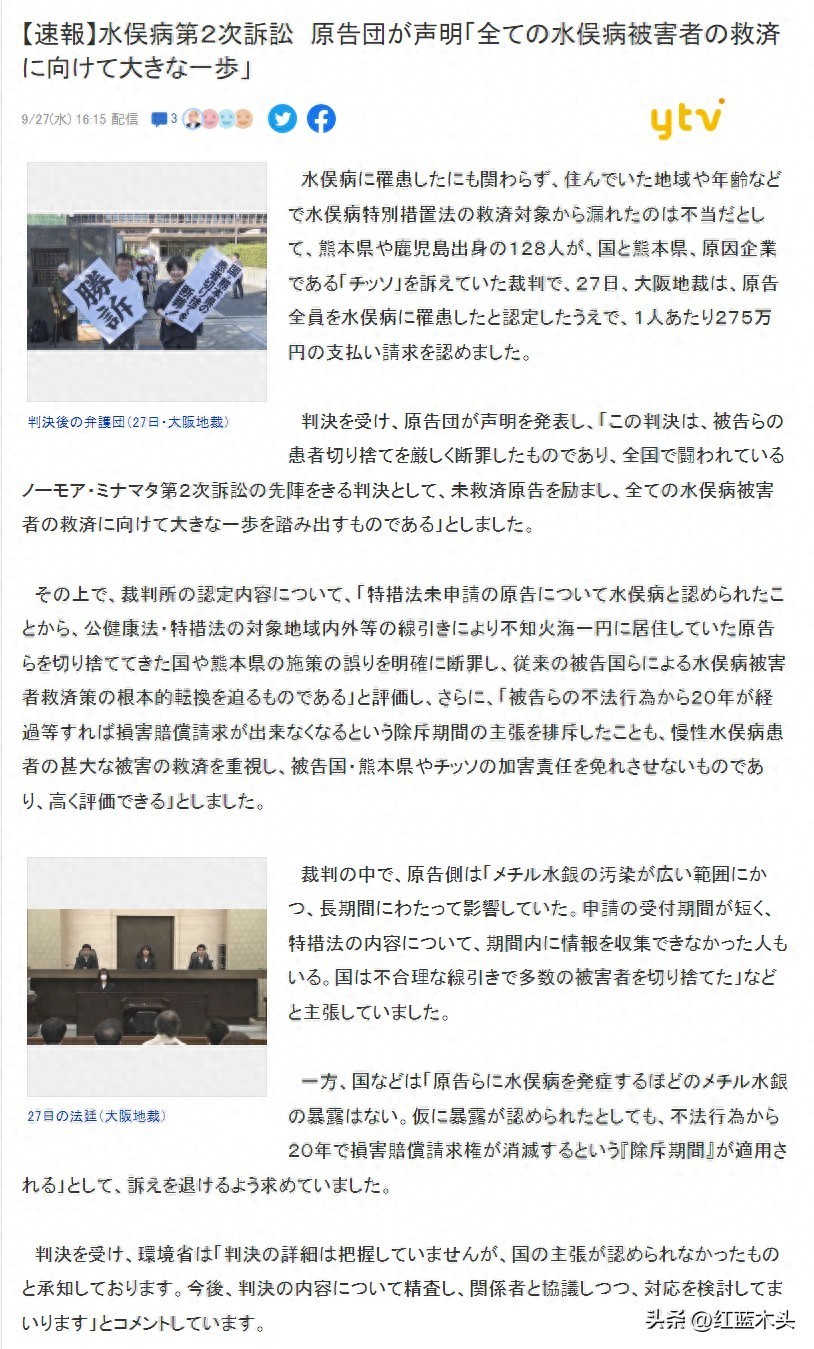 2023年9月27日,大阪地方法院认定全体原告均患有水俣病,并同意了每人支付275万日元的请求,约合人民币十四五万。