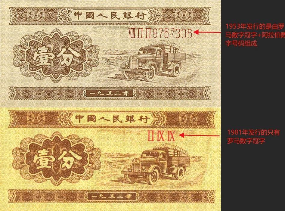 1953年发行的是由罗马数字冠字+阿拉伯数字号码组成,1981年发行的只有罗马数字冠字。