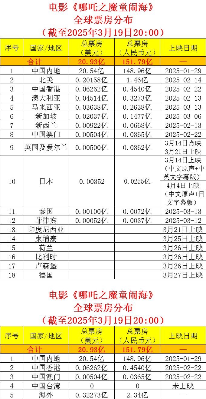 1、据猫眼专业版数据,截至2025年3月19日20:00,《哪吒之魔童闹海》累计票房(含预售及海外票房)151.79亿,排名全球影史票房榜第5位。海外票房2.34亿。与第4位《泰坦尼克号》(164.23亿)的差距为12.44亿,与第3位《阿凡达:水之道》(168.25亿)的差距为16.46亿。