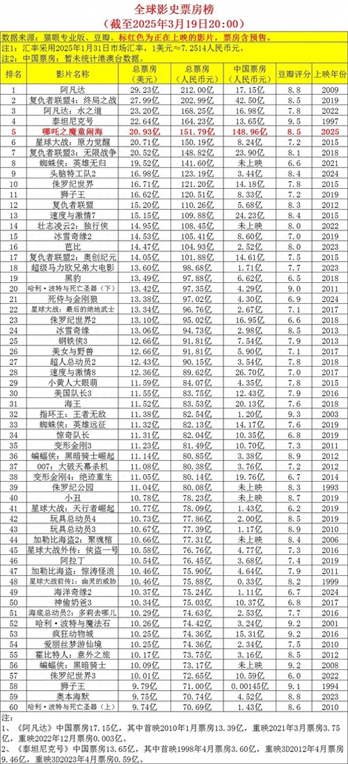 【电影票房】全球影史票房榜(截至2025年3月19日20:00)