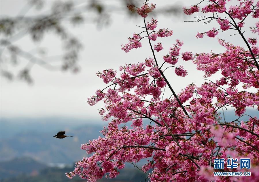 3月5日,一只小鸟在台品樱花茶园里飞翔。 当日是二十四节气中的惊蛰,福建省漳平市永福镇台品樱花茶园里数千株樱花绽放,美景如画。 新华社记者 魏培全 摄