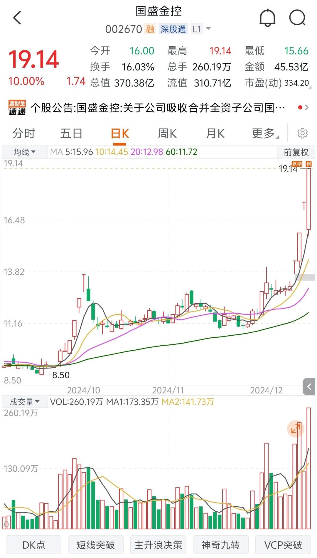行情启动时的天风证券 ,绝对的领头羊 一口气干了七个涨停板。 中期炒名字的时候,与龙有关的锦龙股份,一连还几个涨停。 现在炒重组,国盛金控今天又涨停了。 不经意间渣男券商,让你看到了从惊吓 变成惊喜的小确幸。
