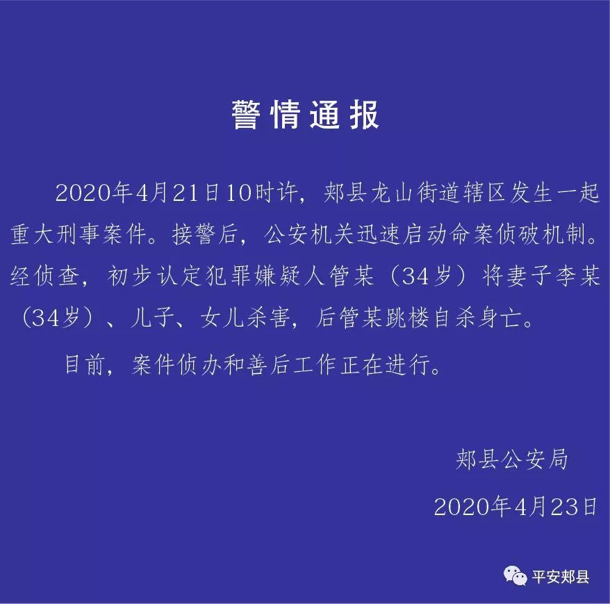 据河南平顶山郏县公安局官方微信23日通报,2020年4月21日10时许,郏县龙山街道辖区发生一起重大刑事案件。接警后,公安机关迅速启动命案侦破机制。经侦查,初步认定犯罪嫌疑人管某(34岁)将妻子李某(34岁)、儿子、女儿杀害,后管某跳楼自杀身亡。