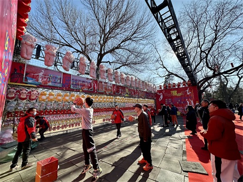 龙潭春节文化庙会作为京城著名庙会之一,以独特的体育、公益、民俗等特色独树一帜。今年的龙潭庙会上体育活动依旧是特色,游乐区域内很多市民都在体验套圈、投沙包等传统庙会游戏,投篮球的游戏吸引了更多青少年参加。记者体验后发现,现场准备的篮球气打得刚刚好,如果平时有篮球运动基础,稍微控制下力度总能赢得一些奖品。