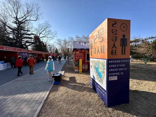 一些服务也十分人性化,在公园各主要节点处,都设置了带编号的“寻人桩”,并附带大尺幅地图,方便市民游客寻找亲友。龙潭公园路标下方原有地图也更新为春节庙会版“特别地图”;如果手机没电了也不用慌,每个庙会服务站旁边都设置了“共享充电宝”租赁柜;人流量大也不用担心上厕所排长队,在人员集中区域都设置了移动厕所,并安排保洁人员随时清扫。