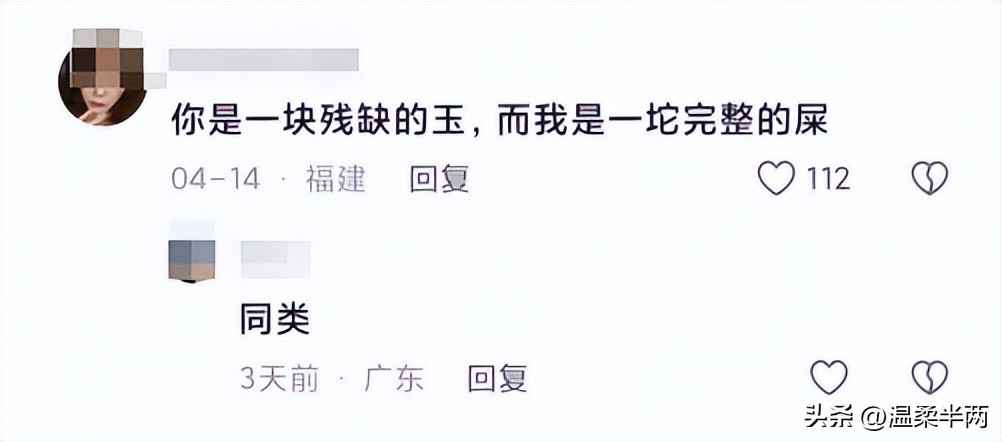 还有网友幽默的调侃,你是一块残缺的玉,而我是一坨完整的屎。惹得评论区纷纷点赞。