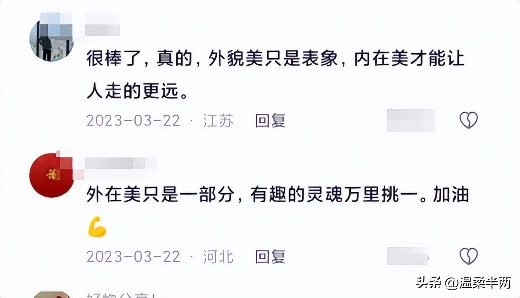 就像网友说的一样,外貌美只是表象,内在美才能让人走的更远。正如那句好看的皮囊千篇一律,有趣的灵魂才是万里挑一。