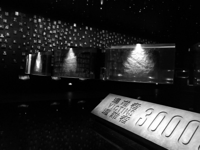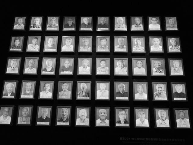序厅的周围是南京大屠杀幸存者的照片墙,共展出1213张照片。左右两边对称排列的1113张是已经离世的幸存者的黑白照片,而后面墙上对称排列的100张彩色照片是截止2017年9月30日在世的幸存者,仿佛他们仍然在凝望着这段历史。就在11月15日,佘子清老人离世,他的照片灯箱也随之熄灭。目前登记在册的幸存者已不足百人。