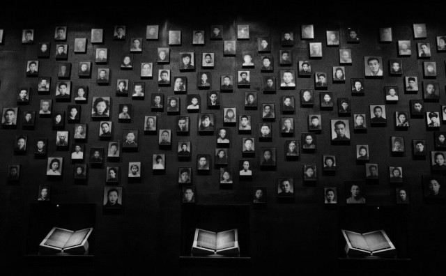两侧壁龛里陈列的是南京大屠杀死难者名录铁书,共展出18本,约12000个死难者名单,观众可以翻阅。讲解员介绍,之所以将它命名为“铁书”,一是书中这些死难者名录,是侵华日军南京大屠杀暴行的铁证;二是因为这本书的材料是金属质地。序厅顶面满天星空的设计,是生命如繁星的寓意,是运用现代的设计语言营造出庄严肃穆的缅怀氛围。
