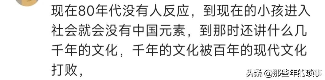 还有网友的意思是说,为什么80年代没有这么多的反应,现在社会如此发达还有这么多的文化入侵,等彻底没有了“中国元素”,到那时还谈什么千年文化。